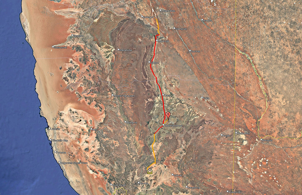 Il est temps de nous remettre en route car nous avons encore 170 km pour rejoindre notre hébergement de ce soir situé à plus de 2h. Peu après la ville de Keetmanshoop, nous bifurquons sur la route B4 et 35 km plus loin, nous quittons l'asphalte pour prendre la piste C12. Cette dernière portion est un vrai plaisir : large, bien entretenue, sans le moindre nid-de-poule… et pour couronner le tout, nous avons la route rien que pour nous !